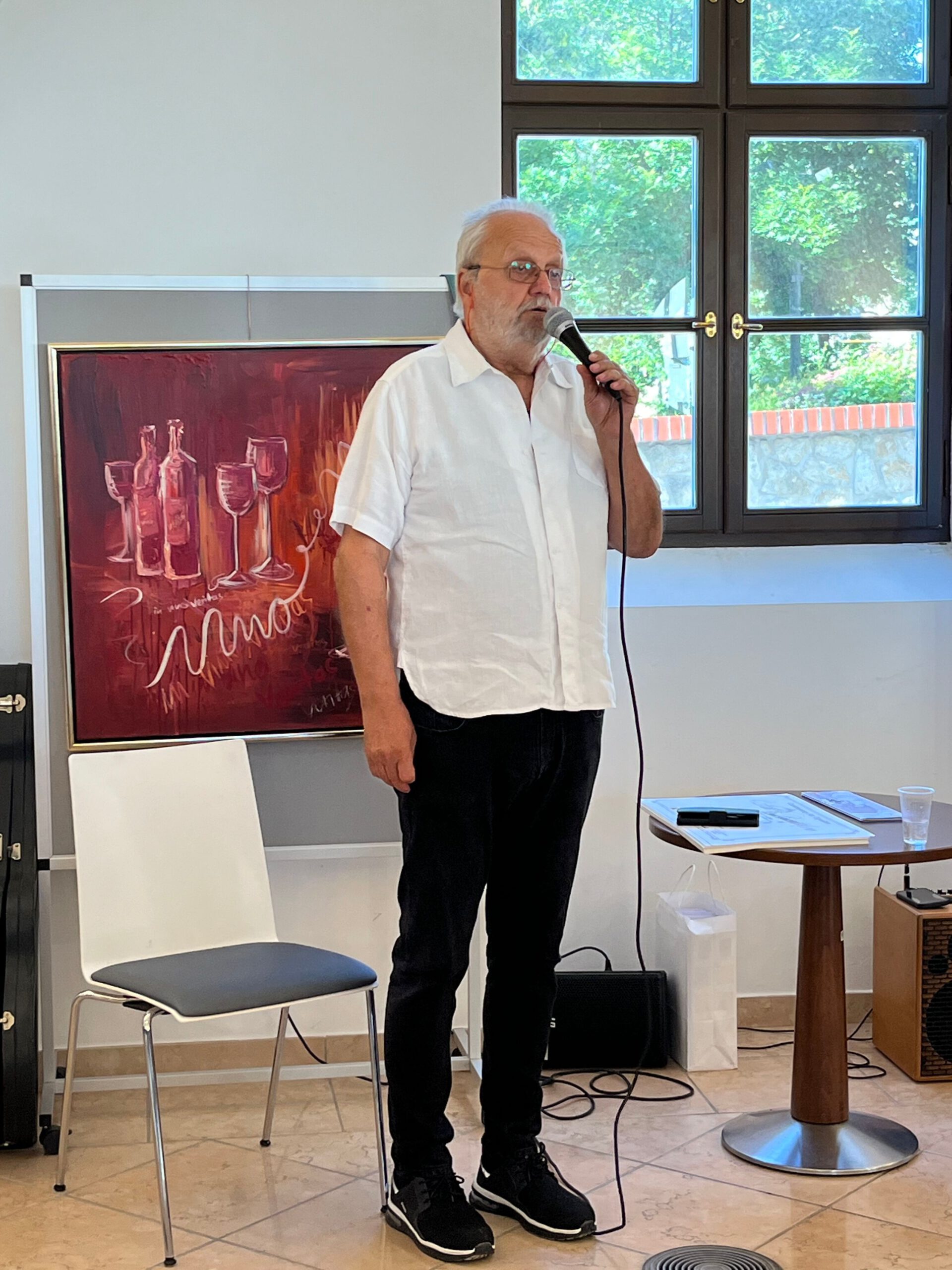 Meine Antwort: „35 Künstler unterschiedlicher Nationalität stellen ihre Arbeiten in den unterschiedlichsten Techniken und Stilen zur Schau. Das Ergebnis ist diese harmonische Ausstellung – DAS IST DAS EXPERIMENT!“